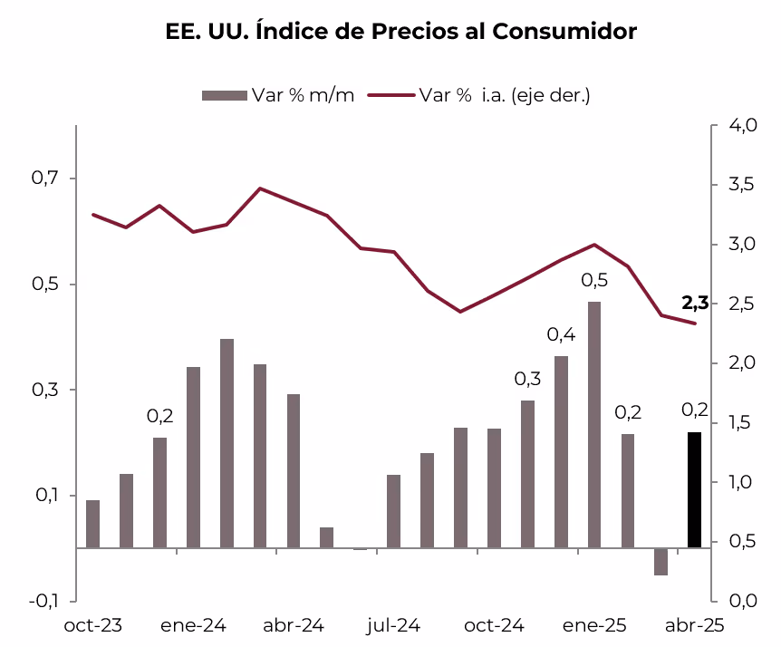 Desinflación en pausa. Tras la caída de 0,1% m/m de la inflación general y la suba de 0,1% en la medición core en marzo, en abril la inflación minorista tuvo un leve repunte en el margen. Si bien en términos interanuales mantiene una tendencia descendente, aún está por encima del objetivo de 2,0% de la Fed. En concreto, en abril el IPC general marcó un alza de 0,2% m/m, levemente por debajo de las expectativas, acumulando en los últimos doce meses una suba de 2,3% –el menor incremento desde febrero de 2021–. El repunte mensual se debió a los precios de la energía y el transporte que, tras la baja registrada en marzo, volvieron a aumentar, al tiempo que se aceleraron los incrementos en vivienda y salud, ambos con un alza del 0,5% m/m. La buena noticia es que, ante la acumulación de inventarios, por el momento fue muy bajo el impacto de la suba de aranceles. Igual tendencia mostró el IPC núcleo, que anotó un aumento de 0,2% m/m y 2,8% i.a.