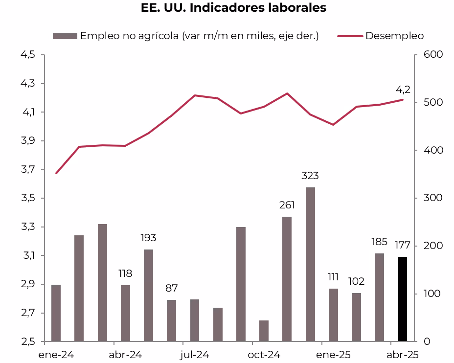 El mercado laboral resiste. A pesar de la incertidumbre, el mercado laboral mantuvo una dinámica saludable, permitiendo que la tasa de desocupación se mantenga en niveles históricamente bajos, en un contexto en el que los salarios continuaron mejorando su poder de compra. Concretamente, en abril se crearon 177 mil nuevos puestos de trabajo no agrícolas que, si bien estuvieron levemente por debajo de los 185 mil creados en marzo, superaron las expectativas y quedaron por encima del promedio de creación de empleo de los últimos doce meses, de 157 mil. Dado que en el mismo mes el empleo agrícola aportó otros 259 mil nuevos puestos, la cantidad total de empleos generados no alcanzó a compensar la suba de 518 mil en la Población Económicamente Activa (PEA), lo que implicó un aumento de 82 mil personas desocupadas. Sin embargo, esto casi no incidió en la tasa de desocupación, que se mantuvo en 4,2%, un nivel históricamente bajo. En paralelo, los salarios —medidos por el promedio por hora del sector privado— aumentaron 0,2% m/m, levemente por debajo de marzo (0,3% m/m), acumulando en los últimos doce meses un alza de 3,8%, 1,7 pp por encima de la inflación minorista. De esta forma, con el empleo privado creciendo al 1,2% i.a. y salarios reales en alza, la masa salarial aceleró el crecimiento al 2,9% i.a., siendo un buen “colchón” para el consumo privado.