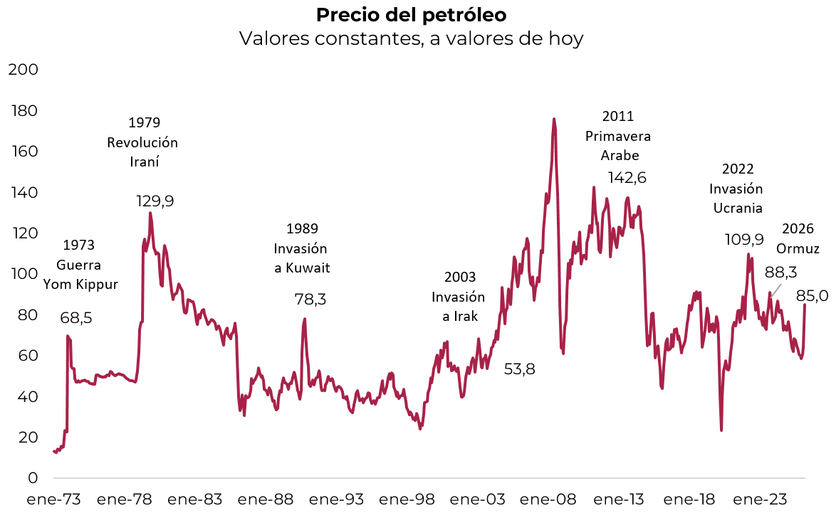 El impacto. Como era de esperar –y como suele ocurrir cada vez que se dan estos eventos en Medio Oriente– la escalada del conflicto disparó el precio del petróleo, que salió de la “lateralización” que venía mostrando durante el último año –se movió en un rango de entre USD 60 y USD 70 el barril de WTI– y saltó para ubicarse en torno a los USD 100 el barril. El motivo de la escalada no es tanto por el peso de Irán en la producción de petróleo –alrededor de 3,5 millones de barriles por día, lo que representa casi el 4% de la oferta mundial, muy alejado de la participación que tienen Arabia Saudita y EE. UU.– sino por su ubicación geográfica y la capacidad de atacar y afectar la producción de los países del golfo. En cuanto a su ubicación, controla el Estrecho de Ormuz, canal marítimo de apenas 3 km de ancho por donde pasa más del 20% del petróleo mundial y el 25% del gas. Pese a la activa participación de EE. UU. tratando de contener los ataques a buques petroleros, la actividad en el estrecho se derrumbó casi un 90% y el mercado empezó a incorporar una prima geopolítica más alta. El escenario base sigue siendo de disrupciones acotadas, sin bloqueo completo –un cierre implicaría un salto extremo en los precios energéticos y una escalada mayor del conflicto–, pero con suba de costos de logística que pondrán tensión a la inflación, justo en un contexto donde muchos bancos centrales aún no la han terminado de controlar, reduciendo su margen para bajar tasas. Además, la disrupción de rutas clave –Mar Rojo, Golfo Pérsico– aumenta los tiempos de entrega, afectando el comercio internacional y las cadenas de suministro, impactando los volúmenes de comercio y la actividad global. Si la escalada se intensifica, el riesgo pasa a ser un shock más profundo, con impacto significativo en el crecimiento global, especialmente en economías importadoras de energía como Europa y varias emergentes.