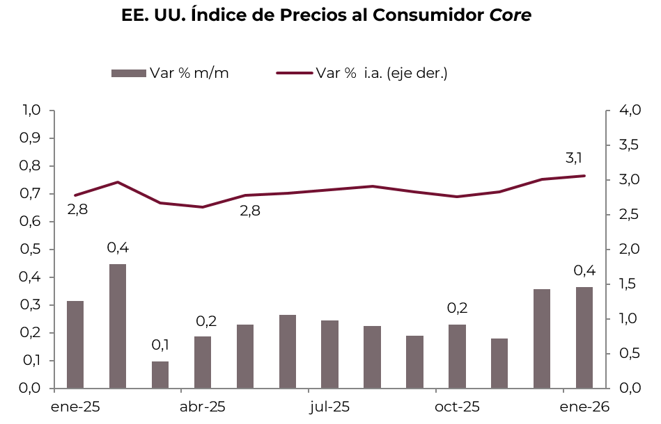 La macro. Mientras tanto, la evolución macroeconómica de EE. UU. mostró un comportamiento mixto, aunque con un sesgo más negativo considerando las revisiones a la baja de varios indicadores, con señales crecientes de desaceleración y tensiones inflacionarias. Por el lado de la actividad, el PBI del 4Q25 creció apenas 0,7% t/t anualizado –contra 1,4% de la primera estimación–, marcando una desaceleración significativa respecto al 4,4% previo. Este arrastre se reflejó en un inicio débil de 2026, con indicadores que apuntan a menor dinamismo del consumo y la inversión. El mercado laboral siguió con un pobre desempeño en la creación de empleos, alternando una recuperación en enero con un marcado retroceso en febrero, reflejo de la debilidad de la demanda, aunque la tasa de desocupación se mantiene en niveles históricamente bajos y con salarios que suben por encima de la inflación. En cuanto a esta última, el PCE interrumpió la tendencia a la baja y en los últimos doce meses acumuló un alza de 3,1%, alejándose del objetivo de la Fed; las perspectivas no son alentadoras considerando la suba de los precios de la energía. Con este cuadro, la Fed enfrenta un dilema claro: la economía se desacelera, pero la inflación sigue por encima de la meta, lo que lleva a una postura más cautelosa respecto a bajar tasas. Con esto, si bien prevemos que la actividad tenga un leve repunte en el 1Q26, el escenario de estanflación gana probabilidades, aunque nuestro escenario base sigue siendo de un soft-landing y con tasas altas por más tiempo.
