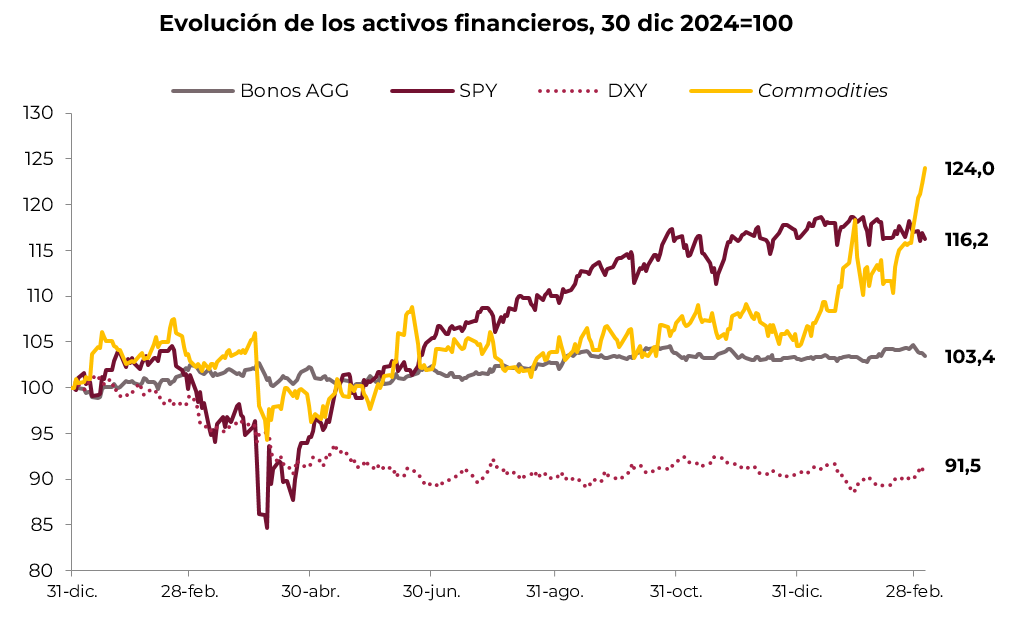 Con este marco de fondo, los mercados operaron con bajas generalizadas, siendo el petróleo y el dólar los únicos ganadores. El alza en las expectativas de inflación presionó sobre los rendimientos de los bonos del Tesoro y, con ello, todos los índices de renta fija retrocedieron, en particular los bonos corporativos de alta calidad y los de mercados emergentes. Por el lado de la renta variable, la caída fue el común denominador, aunque a diferencia de los dos primeros meses, las acciones americanas fueron las que menos sufrieron y se registraron pérdidas importantes en las acciones del resto del mundo, especialmente en Europa, Japón y América Latina. El oro y los demás metales preciosos no captaron el aumento del riesgo, aunque se mantienen en niveles históricamente elevados, al tiempo que el dólar recuperó terreno contra todas las monedas.