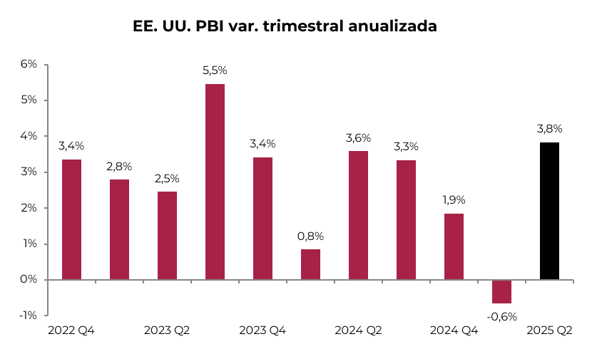 La economía creció –y crece– más de lo previsto. Luego de caer 0,6% t/t (siempre en términos anualizados) en el 1Q25, en el 2Q25 el PBI de EE. UU. se recuperó y creció 3,8% t/t, 0,5 pp más que en las dos primeras estimaciones –se revisó al alza el gasto de consumo–. La buena performance del trimestre estuvo determinada por la recuperación del consumo privado, que avanzó 2,5% t/t (vs. 0,6% t/t en el 1Q25) y por el consumo público que logró un alza de 0,1% t/t (vs. una caída de 1,0% en el trimestre anterior). También fue gracias al mayor aporte de las exportaciones netas, dado que la baja de 29% t/t de las importaciones (vs. aumento de 38% t/t en el 1Q25) más que compensó el retroceso de 1,8% t/t de las exportaciones (vs. suba de 0,2% t/t en el 1Q25), lo que resultó en un aporte de 4,8 pp al PBI del trimestre (en el 1Q25 había restado 4,7 pp). Estos componentes contrarrestaron el menor dinamismo de la inversión privada, que se expandió 4,4% t/t (vs. 7,1% t/t en el 1Q25). Vale destacar que el aporte de los inventarios fue negativo en 3,4 pp (en el trimestre anterior había sumado 2,6 pp), por lo que las ventas finales crecieron 7,3% t/t. Una mirada más amplia del PBI muestra que, a pesar de este buen desempeño, en la primera mitad del año el PBI neto de inventarios creció 2,3% anualizado, levemente por debajo del 2,8% registrado en 2024.