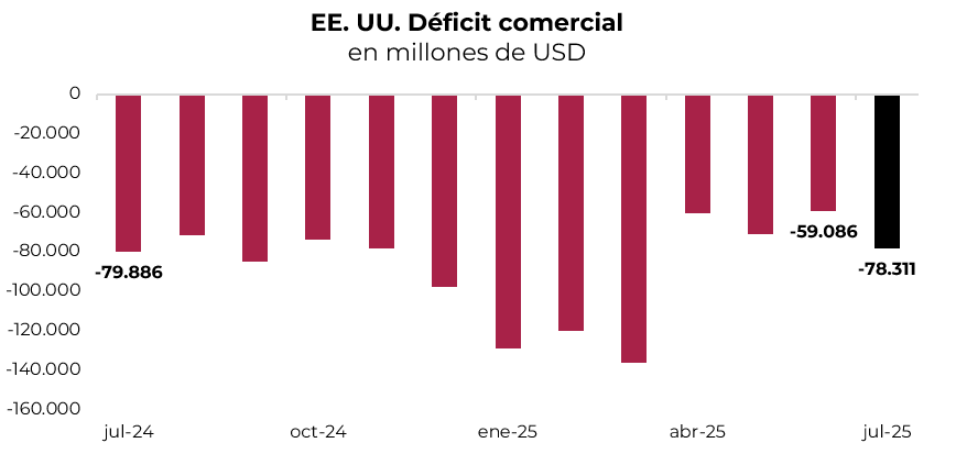 Subió el déficit comercial. El déficit de la balanza comercial de bienes y servicios de julio se amplió a USD 78.300 M –el más alto en cuatro meses–, muy por encima de los USD 59.100 M registrados en junio, debido a que las exportaciones subieron solo 0,3% m/m –las de bienes 0,1% m/m y las de servicios 0,6% m/m–, mientras que las importaciones aumentaron 5,9% m/m –las de bienes 7,0% m/m y las de servicios 2,3%–. Comparado con un año atrás, a pesar del aumento de los aranceles y de la debilidad del dólar, las exportaciones crecieron 5% y las importaciones 3%, por lo que el déficit comercial se mantuvo prácticamente igual. Con este resultado, en los primeros siete meses del año el saldo comercial acumuló un déficit de USD 650.000 M, casi 30% más que en el mismo período del año pasado, explicado por la aceleración que tuvieron las importaciones en los primeros tres meses del año.