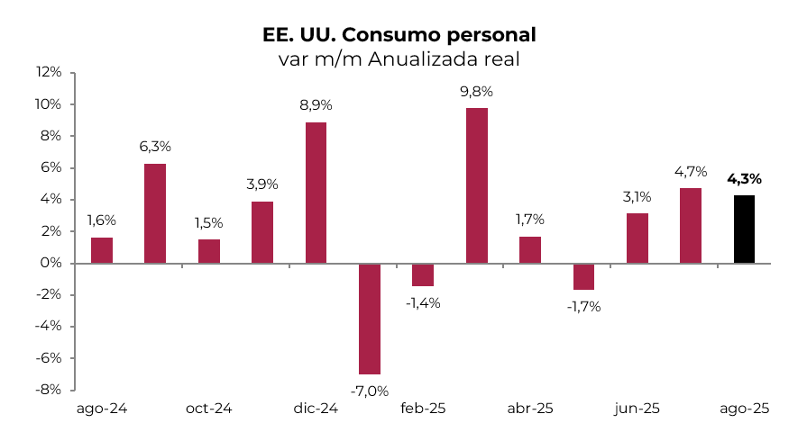 Sube el consumo y cae el ahorro. De la mano de la mejora en la confianza del consumidor, el consumo continúa en alza. En agosto los ingresos de las familias mantuvieron el ritmo de los meses previos y crecieron 0,4% m/m, sostenidos por los ingresos salariales, acumulando en los últimos doce meses un incremento de 4,7%. Más fuerte fue la dinámica del gasto, que avanzó 0,6% m/m y 5,4% i.a., lo que resultó en una tasa de ahorro de 4,3% de los ingresos, 0,2 pb por debajo de julio y del 5,0% de junio. Medido en términos reales y anualizados, el consumo en agosto creció 4,3%, gracias a que el consumo de bienes subió 8,3%, a diferencia del de servicios que lo hizo en 2,5%. Con esto, dado que en julio el gasto real había crecido 4,7%, el consumo privado del 3Q25 marcaría una expansión de 2,8% t/t.