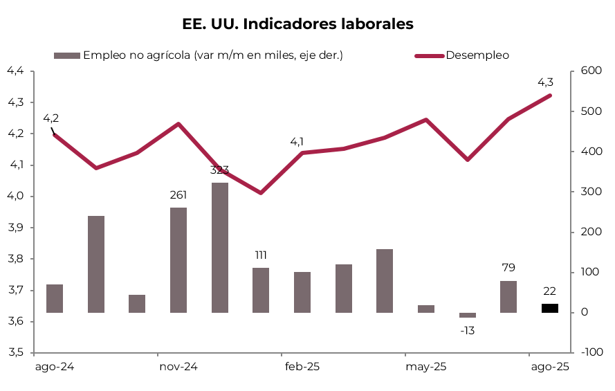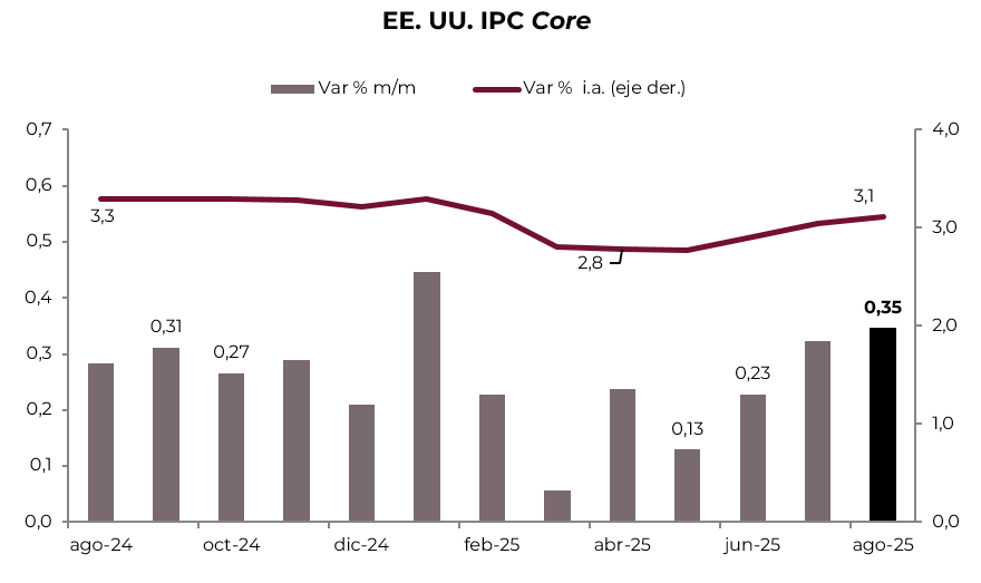 Volvió a subir la inflación. Los datos de inflación de julio volvieron a encender luces amarillas sobre la dinámica de precios tras la suba de aranceles, que interrumpió el proceso de desinflación iniciado el año pasado y aleja cada vez más al IPC del objetivo de la Fed. Si bien el índice general marcó un alza de 0,2% m/m, levemente por debajo del 0,3% m/m de junio y de las expectativas del mercado, en los últimos doce meses la suba llegó a 2,7%, acelerando respecto al 2,3% i.a. registrado en marzo. La mayor preocupación vino del lado del IPC Core, que avanzó 0,3% m/m –el mayor incremento desde enero– y acumuló en el último año un aumento de 3,0%, la más alta desde febrero. Así, en los últimos tres meses el IPC Core subió 2,8% anualizado y se estima que, para que la Fed logre su objetivo de llevar el PCE Core al 2% i.a., el IPC Core debería ubicarse en 2,3% i.a. En la misma línea, el índice de precios implícitos del consumo (PCE) –la medida de inflación preferida de la Fed– en agosto aceleró a 0,3% m/m (vs. 0,2% m/m de julio), acumulando en el último año un alza de 2,7% –los precios de bienes subieron 0,1% m/m y los de servicios 0,3% m/m–, mientras que el PCE total anotó un aumento de 0,2% m/m y 2,9% i.a. Recordemos que la Fed estima que este año el PCE y el PCE Core avancen 3,0% i.a. y 3,1% i.a., respectivamente, y que el año próximo moderen su incremento a 2,6% i.a.