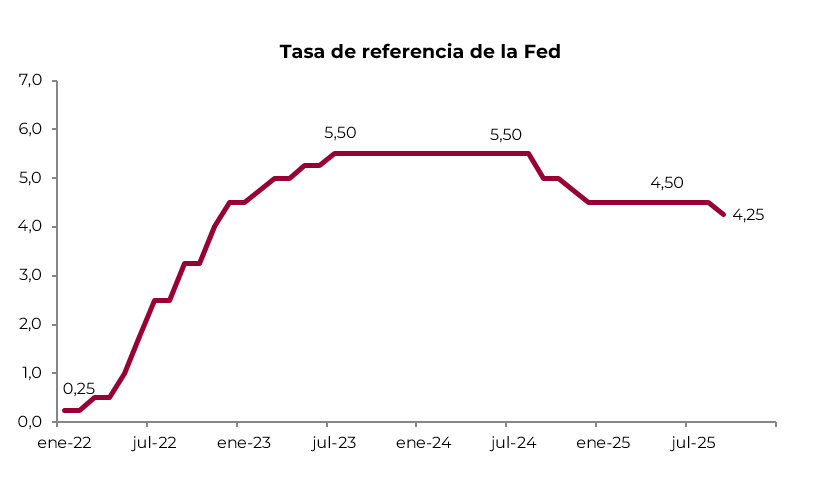 Priorizando el empleo. Por primera vez desde la reunión de diciembre del año pasado y tal como preveía el mercado, en la reunión del 17 de septiembre la Fed anunció un recorte de 25 pb en la tasa de interés de referencia, llevándola a un rango de 4,0% a 4,25%. En línea con lo señalado en el Simposio de Jackson Hole, el comunicado que acompañó la decisión remarcó la debilidad reciente del mercado laboral y advirtió que la inflación seguirá subiendo, aunque a un ritmo menor al esperado previamente, dado que el traspaso a precios de la suba de aranceles a las importaciones viene más lento de lo previsto. Por tales motivos, la prioridad para la Fed pasa ahora a ser la evolución del mercado laboral por sobre la inflación. En consecuencia, esperan dos recortes adicionales de tasas este año por 25 pb cada uno, al tiempo que para el próximo año prevén solo un recorte de igual magnitud, muy por debajo de las expectativas de los analistas, que estiman tres recortes. A su vez, tal como ocurre cada tres meses, la Fed publicó sus proyecciones, que no mostraron grandes cambios respecto de las difundidas en junio, aunque elevaron la estimación de crecimiento para este año a 1,8% –actualmente crece 2,3% i.a.– y para el año próximo, en ambos casos 2 pb más que en la estimación de junio. En cuanto a la inflación, mantuvieron la proyección de 3,0% i.a. para 2025 –hoy en 2,4% i.a.–, y la de 2026 la subieron a 2,6% i.a. (desde 2,4% i.a. en la proyección anterior). La tasa de desocupación se mantuvo en 4,5% para este año y 4,4% para el próximo.