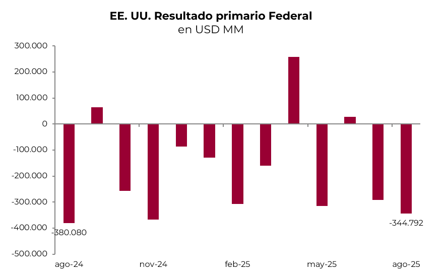Lenta mejora del resultado fiscal. En agosto, el resultado fiscal del gobierno de EE. UU. registró un déficit de USD 345.000 M, lo que representa una caída de 9% i.a., en tanto que el déficit primario bajó 16% i.a. Esta mejora se debió a un incremento de 12,3% i.a. en los ingresos, a partir en gran medida por el aumento de los ingresos aduaneros –que totalizaron USD 29,5 MM en el mes contra apenas USD 7 MM de un año atrás–, dado que sin estos la suba de ingresos se habría reducido a 5,1% i.a. Por su parte, el gasto primario se redujo 1,7% i.a. y el gasto total apenas subió 0,4% i.a., gracias al incremento de 16% i.a. en la carga de intereses. Con este resultado, en los primeros ocho meses del año los ingresos crecieron 10% i.a., al tiempo que el gasto lo hizo al 4,3% i.a., achicando 9% el déficit total –y 25% el déficit primario–. A solo un mes del cierre del año fiscal 2025, el déficit acumulado aumentó 4%, alcanzando USD 1.973 MM.