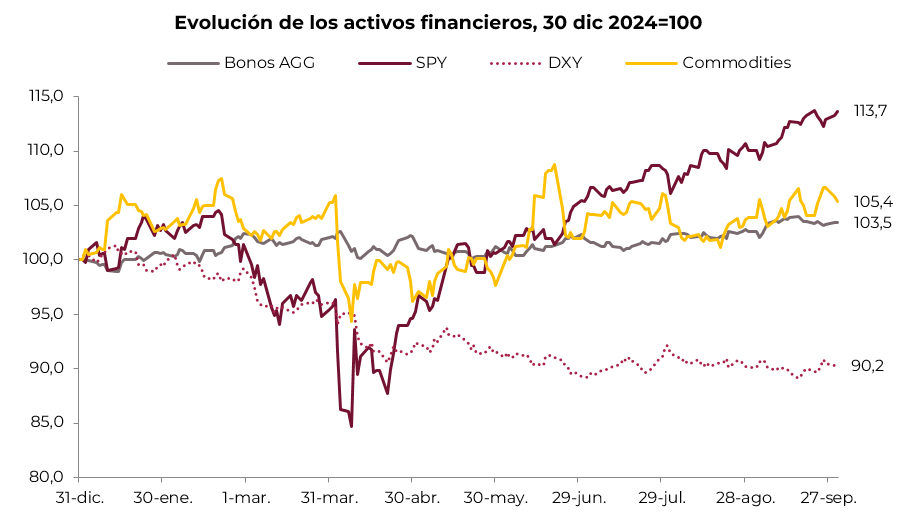 El mercado en septiembre. La combinación de buenos datos de actividad, inflación en alza –aunque en línea con lo previsto– y una Fed que marca el rumbo hacia una política monetaria más laxa impulsó el muy buen desempeño de los mercados durante septiembre. Los rendimientos de los bonos del Tesoro registraron bajas generalizadas, especialmente en el tramo más largo, revirtiendo en parte las subas de los meses previos. La UST2Y cerró el mes en 3,60%, apenas 2 pb por debajo de agosto, mientras que la UST10Y y la UST30Y cedieron 8 pb y 19 pb, finalizando en 4,15% y 4,73%, respectivamente. Esto dio impulso a la renta fija, que avanzó 0,8% en septiembre y acumula en el año una suba de 3,3%, destacándose los bonos corporativos Investment Grade (IG), con ganancias de 1,5% en el mes y 4,2% en el año. En renta variable, los tres principales índices de EE. UU. alcanzaron nuevos máximos históricos: el S&P 500 subió 3,3%, acumulando 13,9% en el año; en tanto que el Nasdaq avanzó 5,5% en septiembre y 18% desde fines de 2024 gracias al desempeño de las empresas tecnológicas. El Dow Jones fue el más rezagado, con alzas de 1,7% en el mes y 9,1% en lo que va de 2025. En el frente cambiario, el dólar se mantuvo estable en un año marcado por un fuerte retroceso: el DXY terminó sin cambios en el mes, acumulando en 2025 una baja de 10%, impulsada por la depreciación frente al euro, que cayó 0,4% en septiembre y 11,7% en el año. Entre los commodities, el oro se destacó con un fuerte repunte, alcanzando un nuevo récord tras subir 12% en el mes y 43% en lo que va del 2025. El resto mostró un desempeño dispar, con el petróleo en baja de 3% en el mes y 14% en el año, afectado por las perspectivas de mayor exceso de oferta debido al aumento de producción y a la menor demanda.