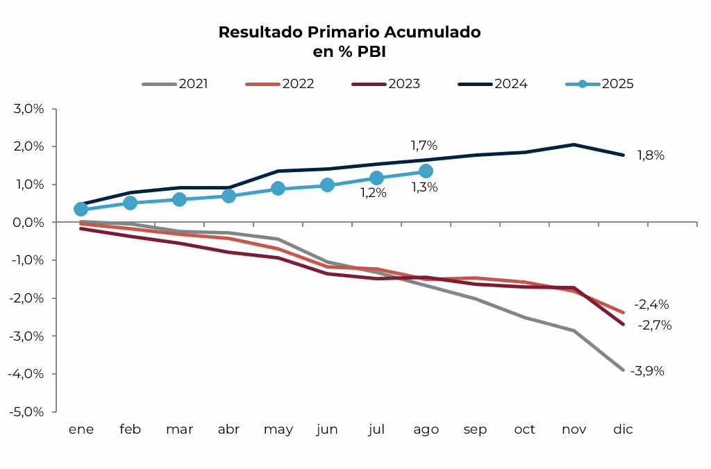 Sosteniendo el ancla fiscal. Aunque las cuentas públicas continúan mostrando resultados positivos, las perspectivas lucen más desafiantes debido al impacto del menor nivel de actividad y a las bajas transitorias de algunos tributos sobre la recaudación, mientras el gobierno busca darle mayor dinamismo al gasto en un intento por ganar apoyo de los gobernadores y fortalecer su gobernabilidad. En agosto, el Sector Público registró un superávit financiero de 0,05% del PBI y uno primario de 0,2% del PBI. Los ingresos cayeron 3% i.a. real –principalmente por la baja en impuestos internos (-18% real) y derechos de exportación (-30%)–, mientras que el gasto primario se redujo 6,0% i.a. real, explicado por menores subsidios económicos (-39% real), transferencias a provincias (-51%), obra pública (-37%), programas sociales excluyendo AUH (-31%) y salarios (-7%). En cambio, los únicos rubros que crecieron fueron jubilaciones (+4% real) y AUH (+9%). Los intereses pagados disminuyeron 3% i.a. real. Con este resultado, en los primeros ocho meses de 2025 el Sector Público Nacional acumula un superávit financiero de 0,4% del PBI y uno primario de 1,3% del PBI (vs. +0,3% y +1,5% en 2024, respectivamente), con ingresos retrocediendo 1% i.a. real y gasto primario aumentando 2% i.a. real, a raíz de mayores erogaciones en jubilaciones con bono (+13% real), AUH (+30%) y transferencias a provincias (+74%). De cara a los próximos meses, el panorama se presenta más complejo, dado que la recaudación tributaria viene debilitándose –en septiembre cayó en términos reales por segundo mes consecutivo–, mientras que el gasto ganaría dinamismo por mayores transferencias a provincias y por proyectos de ley aprobados por el Congreso que, pese a haber sido vetados por el presidente, fueron ratificados por amplia mayoría, implicando un costo fiscal de al menos 1% del PBI. Incluso en el proyecto de Presupuesto 2026 enviado al Congreso, el gobierno estima que el superávit primario de este año será de 1,5% del PBI –una meta difícil de cumplir– y proyecta para 2026 un superávit de 1,6% del PBI, frente al 2,2% comprometido en el acuerdo con el FMI.