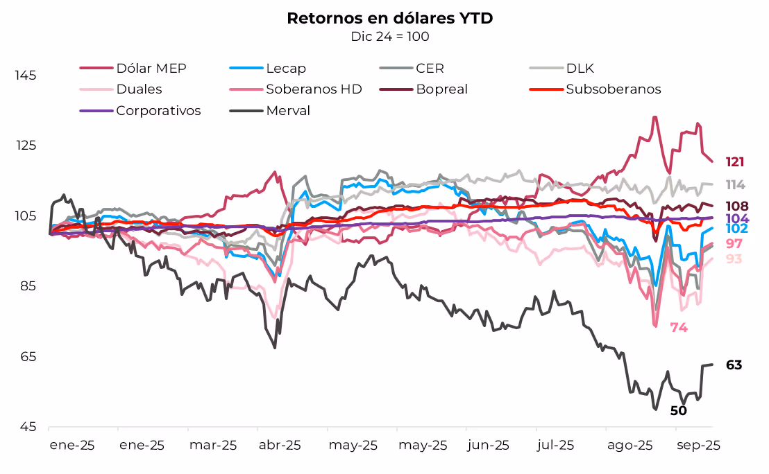 Volatilidad generalizada en los activos. En el último mes se observaron dos períodos contrapuestos. Tras el resultado de las elecciones en PBA, se registraron caídas generalizadas, suba de tasas y una mayor demanda de cobertura de cara a las elecciones nacionales. Sin embargo, desde el 22 de septiembre, con el apoyo del Tesoro de EE. UU., esas caídas se revirtieron, acompañadas por una baja del riesgo país y mejoras en las curvas.