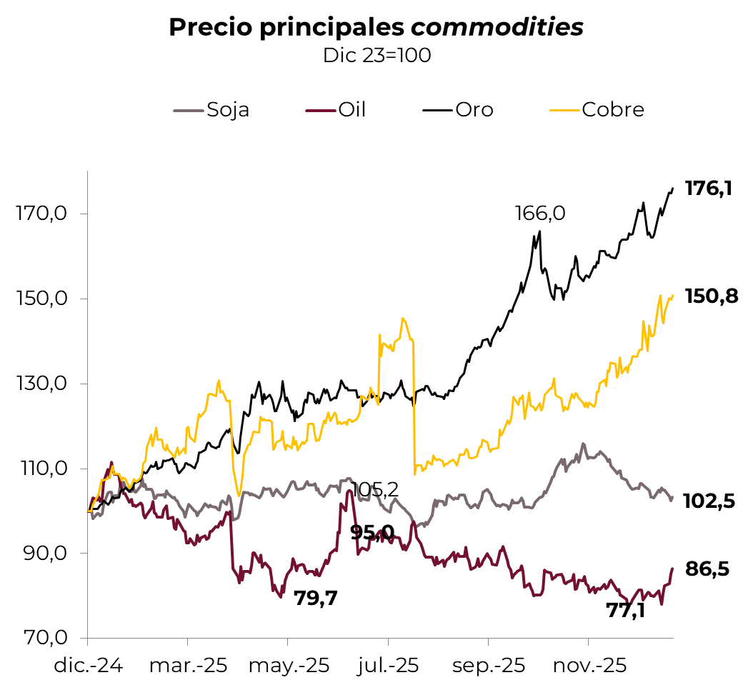 En este marco, los mercados globales siguen mostrando un buen desempeño. Aunque no exentos de volatilidad, los principales índices de renta variable continúan en niveles récord, empujados por la fortaleza de los resultados de sus balances, que justifican las valuaciones. En la renta fija, pese a la presión sobre los rendimientos de los bonos del Tesoro, los bonos corporativos –tanto los de mayor calidad como los de alto rendimiento– tuvieron una buena performance y siguieron comprimiendo spreads. El dólar no se recuperó de la caída registrada en los primeros meses del año pasado, aunque mantiene una tendencia estable. En cuanto a los commodities, los factores geopolíticos continuaron afectando el desempeño de corto plazo, aunque la tendencia es bajista para los energéticos –mayor producción global–, estable para los agrícolas –aunque con presión a la baja por las buenas perspectivas para la cosecha– y alcista para los metales –especialmente el cobre, empujado por la mayor demanda para semiconductores–. En el caso de los metales preciosos, como el oro y la plata, la incertidumbre les sigue jugando a favor, con una mayor demanda como refugio de valor por parte de bancos centrales e inversores, lo que les permite superar nuevos máximos históricos.
