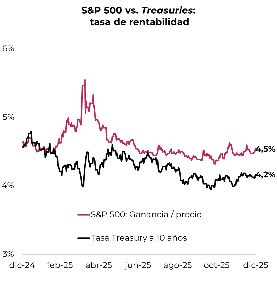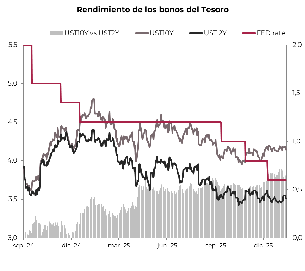Las perspectivas para este año siguen siendo constructivas, aunque en el último mes los riesgos han aumentado, con el foco de atención nuevamente en Trump –por su nueva embestida contra Powell, poniendo en jaque la independencia de la Fed, y por la presión sobre Europa por Groenlandia– y en Japón –las dudas sobre el plan fiscal y la tensión política afectan al mercado de deuda soberana del país–. Esto viene presionando la dinámica de los bonos del Tesoro y puede complicar el escenario base. También es relevante la temporada de balances del 4Q25 y, si bien se esperan buenos resultados, una sorpresa negativa podría golpear a las acciones y generar una corrección abrupta del mercado. Mientras tanto, el oro seguirá aprovechando este contexto volátil para reafirmar su valuación.