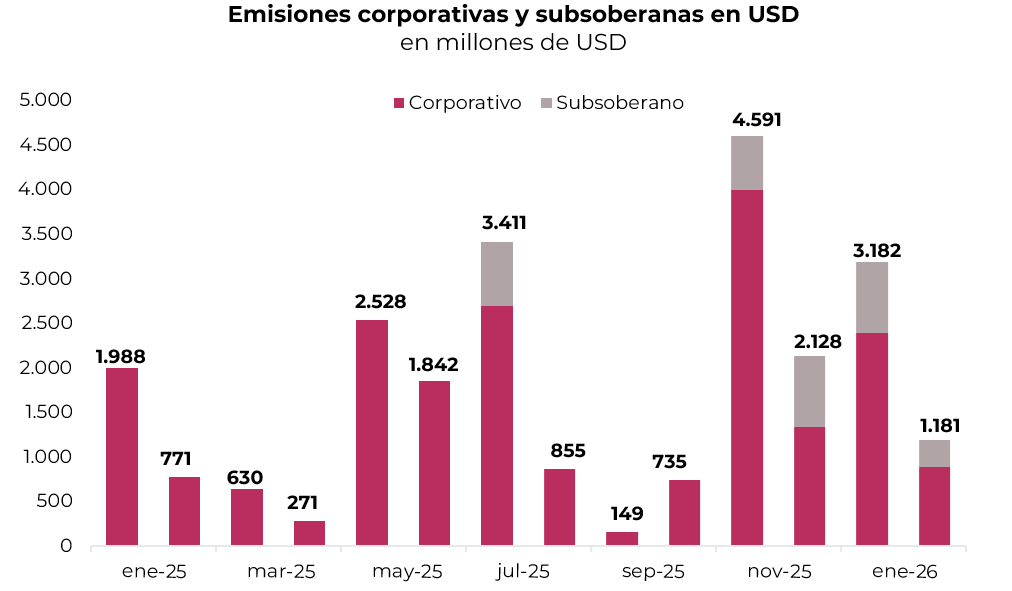 - El Merval retrocedió 13,7% en pesos y 11,8% en dólares CCL en febrero, para cerrar en USD 1.798, mostrando un claro desacople con el índice Latam, que avanzó 3,3% en el mes, reflejando un fuerte sell off de activos argentinos. En lo que va de 2026, el índice cae 10,2%. La corrección mensual fue generalizada, con pérdidas de 12% en bancos, 13% en utilities y 21% en materiales. A nivel de acciones, las mayores bajas correspondieron a COME (-41,6%), Edenor, (-31,3%), y Holcim, (-28,8%), mientras que ByMA subió 7,6% y Transener 4,0%. Por su parte, las acciones argentinas que cotizan en Nueva York cedieron 13,7% en febrero y 9,5% en el año; las mayores pérdidas se observaron en Bioceres, Globant y BBVA, con retrocesos de entre 25% y 33%. Ternium fue la única en terreno positivo con una ganancia de 3,9%.