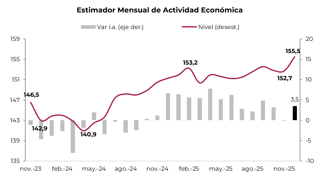 Repuntó la actividad de la mano del agro. Tras dos meses consecutivos contractivos, en diciembre la actividad se recuperó con fuerza, aunque el panorama general sigue siendo el de una economía que perdió impulso, con un comportamiento sectorial heterogéneo, con sectores muy dinámicos y otros en baja. Concretamente, la economía creció 1,8% m/m, quedando 3,5% por encima respecto al mismo mes del año anterior e incluso superó en 0,8% el techo previo registrado en junio de 2022. El crecimiento de diciembre se explicó principalmente por el sector agropecuario que, de la mano de la mejor cosecha de trigo, subió 32% i.a. Le siguió la intermediación financiera y la explotación de minas y canteras, que crecieron 14% i.a. y 9,1% i.a., respectivamente, en tanto que los sectores ligados a la actividad urbana, como comercio, industria y hoteles y restaurantes, cayeron entre 1,0% y 4% i.a. Con esto, en el 4Q25 la actividad se expandió 0,8% t/t y 2,2% i.a., cerrando 2025 con una expansión de 4,4%, lo que implica el primer año de crecimiento luego de dos años recesivos.