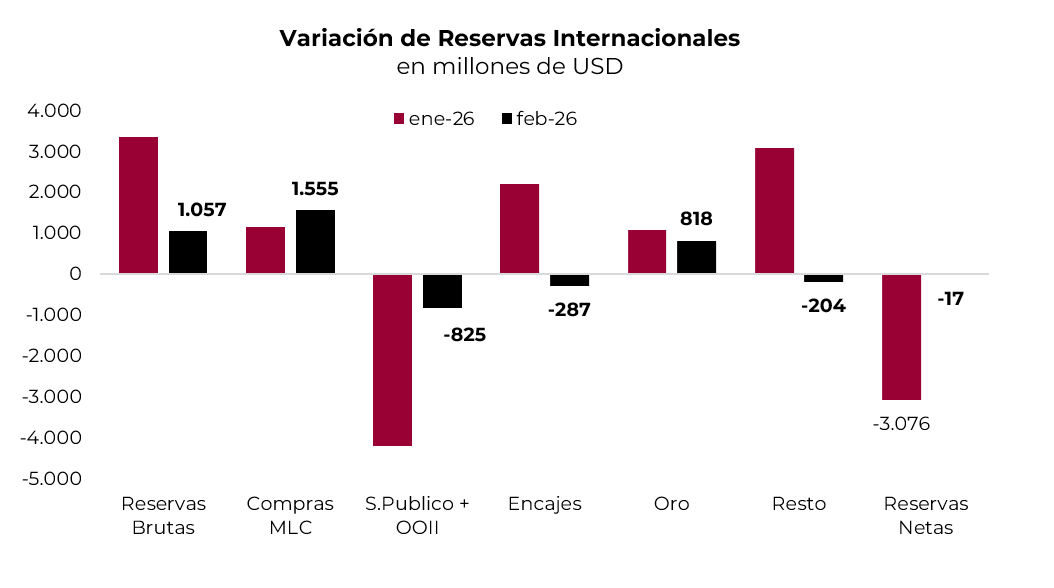 Repuntan las reservas. Las reservas internacionales finalizaron febrero con un stock bruto de USD 45.560 M, lo que representó una suba de USD 1.057 M en el mes. Este resultado fue explicado por la compra neta de divisas por USD 1.555 M y por la revalorización del oro, que le aportó otros USD 818 M. Estos fueron compensados por otras operaciones del sector público —se incluye pago de intereses al FMI— y reducción de encajes en moneda extranjera. Por su parte, el stock de reservas netas quedó prácticamente sin cambios, cerrando el mes con un saldo negativo de USD 19.400 M —de acuerdo con la definición del FMI—, mientras que la versión “tradicional”, que solo resta los encajes, deuda del BCRA y depósitos del Tesoro, cerró en USD 1.015 M negativas. Con este resultado, en los primeros dos meses del año las reservas brutas aumentaron casi USD 4.400 M de la mano de las compras de divisas del BCRA en el mercado de cambios por USD 2.700 M, USD 1.900 M por revalorización del oro, USD 1.900 M por incremento de encajes y USD 2.900 M por otras operaciones, entre las que se incluye el préstamo Repo del BCRA por USD 3.000 M, que fueron contrarrestados en parte por los pagos de deuda por títulos y organismos internacionales por USD 5.000 M.