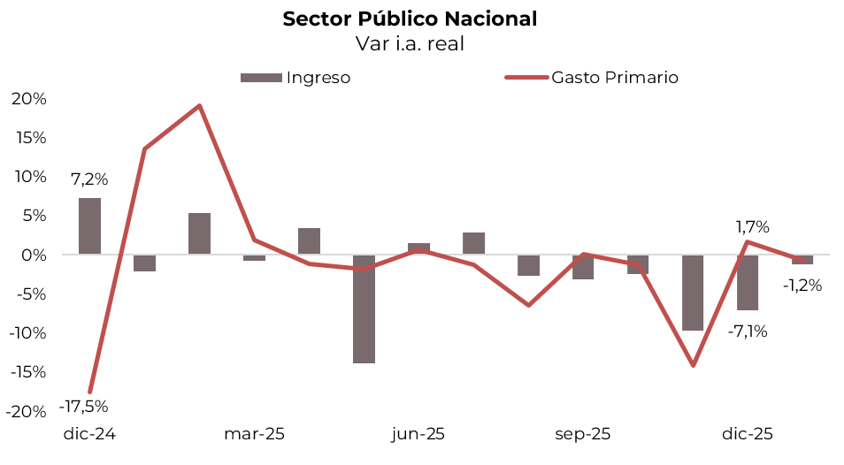Defendiendo el equilibrio fiscal. Como ya es una sana costumbre para esta gestión, en enero el Sector Público volvió a registrar superávit primario y financiero, aunque se sostuvo por ingresos extraordinarios que compensaron la fuerte caída de la recaudación tributaria y el mayor dinamismo de algunas partidas del gasto. Concretamente, en el primer mes del año el Sector Público Nacional registró un superávit primario de $3,13 billones (0,3% del PBI) y un superávit financiero de $1,11 billones (0,1% del PBI), luego de contabilizar los pagos de intereses “caja” —recordemos que la metodología oficial no computa los intereses correspondientes a bonos y letras capitalizables—. El resultado estuvo impulsado por ingresos extraordinarios por $1,04 billones vinculados a la licitación para la operación privada de las represas del Comahue, que permitió compensar el retroceso de 7% i.a. real en los ingresos tributarios —la caída fue generalizada, aunque se destacaron la baja en la recaudación por retenciones, en derechos de importación, en IVA y en los impuestos ligados al mercado laboral—, por lo que los ingresos totales solo bajaron 1,2% i.a. real. Por su parte, el gasto primario cedió 0,7% i.a. real —esto se explicó por reducciones en Salarios, Programas sociales, Obra pública y Jubilaciones con bonos, que más que compensaron el mayor gasto en Subsidios, Transferencias a provincias y AUH—. El pago de intereses bajó 17% i.a. dado el menor vencimiento de intereses no capitalizables, aunque, si se los incluye, el resultado fiscal se revertiría a un déficit de 0,2% del PBI.