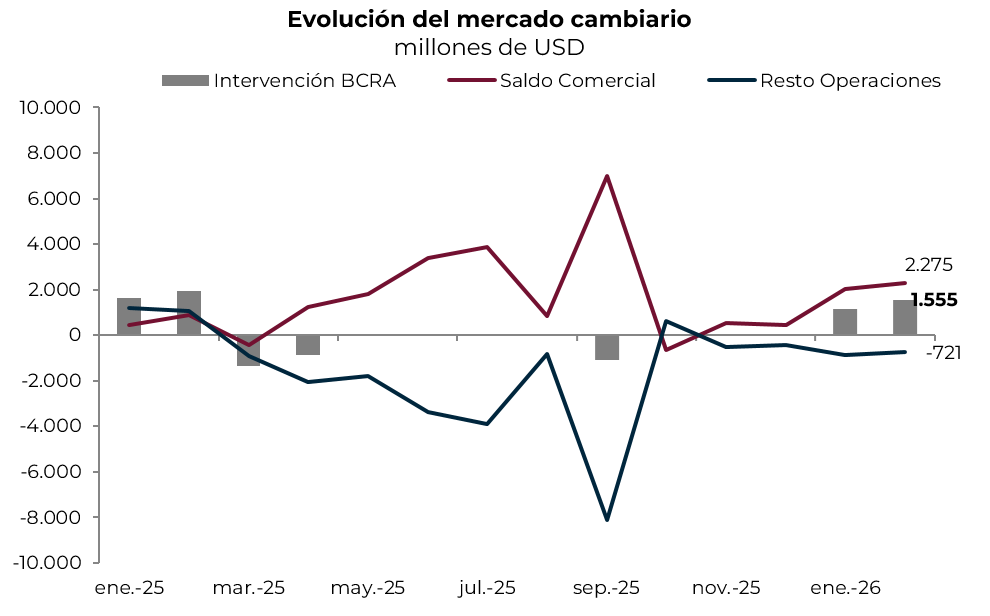 Más agro y menos importaciones, mejoraron el balance cambiario. Luego de que entre marzo y diciembre de 2025 el mercado cambiario operara bajo tensión por el déficit de cuenta corriente y en la cuenta financiera —esto último principalmente por la fuerte dolarización de carteras post liberalización del cepo para personas humanas—, en el arranque del año el BCRA logró una muy buena performance en el mercado de cambios. Adquirió USD 1.100 M en enero y otros USD 1.555 M en febrero, acumulando en el primer bimestre compras netas por USD 2.700 M. La reversión en el resultado se debió a la mejora en el saldo comercial, apoyado en la combinación de mayor liquidación de exportaciones —impulsadas por el agro, que mejoraron luego de la fuerte caída que tuvieron en el 4Q25, dado que se habían adelantado liquidaciones en septiembre en el marco de la eliminación transitoria de retenciones— y menor demanda para importaciones de bienes —esto influido por el pobre desempeño del nivel de actividad y probablemente también por el adelantamiento del año pasado—. El resto de las operaciones habría vuelto a ser deficitario a raíz del rojo persistente en la cuenta de servicios reales y al equilibrio de la cuenta financiera, gracias a que el mayor ingreso por préstamos financieros permitió abastecer la demanda de activos externos. Con este resultado, en los primeros dos meses del año el BCRA acumuló compras netas por USD 2.700 M, 25% menos de lo que había adquirido en el mismo período del año pasado, lo que se explica por el mayor déficit en la cuenta financiera debido a la mayor demanda de activos externos.