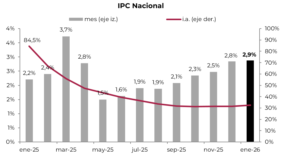 Aceleró la inflación. El IPC Nacional de enero aumentó 2,9% m/m y 32,4% i.a. De esta manera, anotó la octava suba consecutiva, superando las expectativas de los analistas, que estimaban un alza de 2,4% m/m en el último REM y 2,1% m/m en el de un mes atrás. La suba del mes estuvo influida por los precios estacionales, que aceleraron su marcha con un incremento de 5,7% m/m —los precios de verduras subieron casi un 30% m/m— y más que compensaron la moderación en los precios regulados y en el IPC Core, que avanzaron 2,4% m/m y 2,6% m/m, respectivamente, desde 3,3% m/m y 3,0% m/m de diciembre. Para febrero y marzo esperamos un alza no menor al 2,5% m/m, afectado por precios regulados y algunos precios estacionales como educación. La resistencia de la inflación a bajar en un contexto de caída del tipo de cambio nominal erosiona la competitividad del peso y podría generar mayor tensión en el mercado cambiario en el mediano plazo.