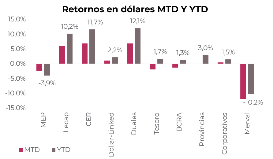 - En línea con la variación que tuvo el tipo de cambio oficial durante febrero, los instrumentos dollar-linked cayeron 1,4% en el mes, acumulando una baja de 1,8% en el año. De esta manera, ofrecen rendimientos de Devaluación +3%, por lo que descuentan una devaluación de 3,5% para abril de 2026.