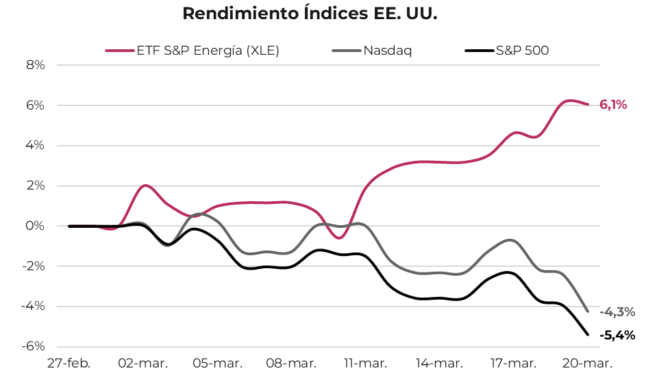 En renta variable, el S&P 500 lleva un retroceso de 5,4% desde el inicio del conflicto, mientras que el Nasdaq, concentrado en firmas tecnológicas, acumula una baja del 4,3%.
