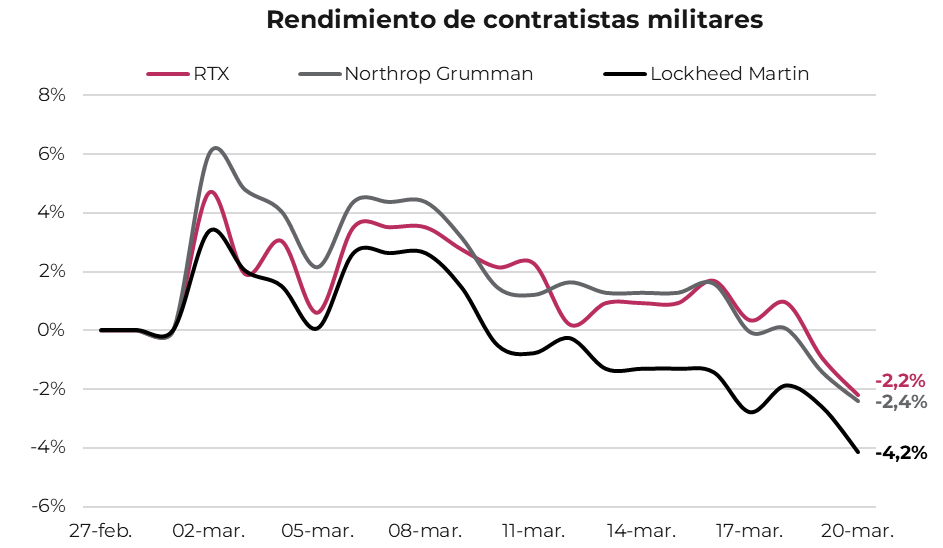 Un caso que merece atención particular es el de los contratistas de defensa. En apariencia, el conflicto debería favorecerlos a través de una mayor demanda de armamento, tanto de Estados Unidos como de sus aliados. Sin embargo, sus cotizaciones revirtieron un avance inicial y acumulan pérdidas de entre 2,2% y 4,2%.