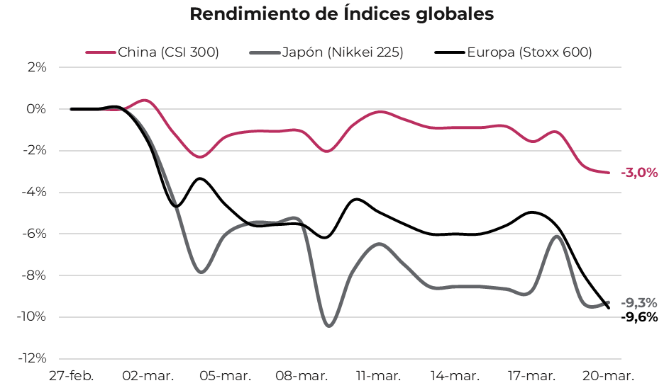 En los mercados internacionales, la presión es generalizada, aunque con impactos desiguales. Japón, altamente dependiente de las importaciones de petróleo del Golfo Pérsico, registra una caída de 9,6% en dólares. En Europa, el índice Stoxx 600 acumula una baja de 9,3%.