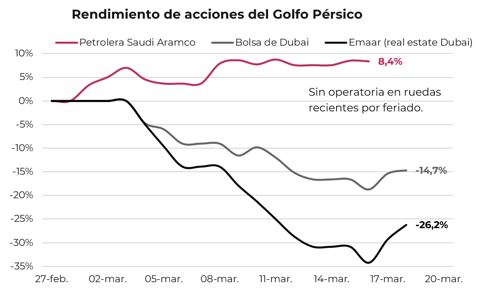 En el extremo opuesto, la bolsa de Dubái cayó 14,7%, golpeada por el daño reputacional sobre su rol como hub regional de negocios. Emaar, el mayor desarrollador inmobiliario de Dubai, lidera las pérdidas con una baja de 26,2%.