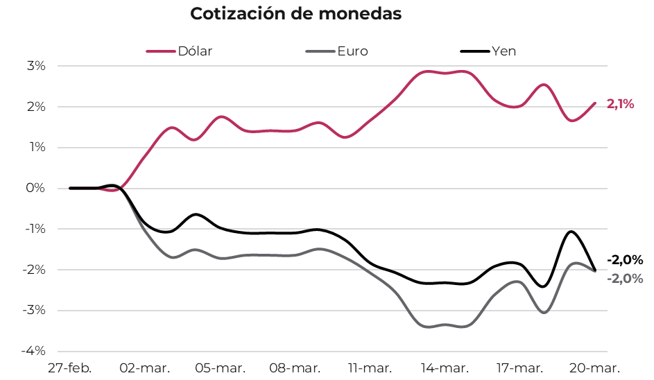 En lo que respecta a monedas, el conflicto devino en una apreciación de 2,1% en el dólar, reforzando la percepción, previamente desafiada, de su utilidad como refugio de valor.