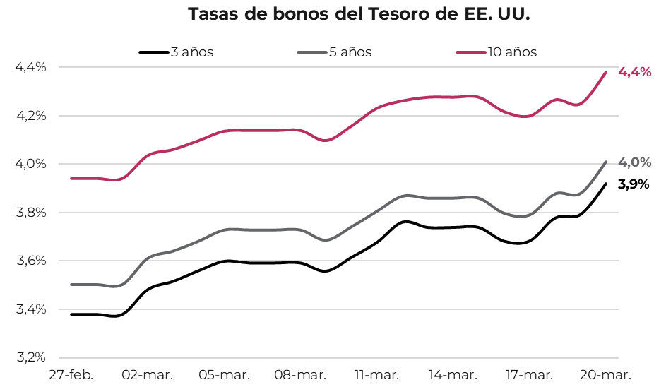En ese contexto, los rendimientos de los bonos del Tesoro a 3, 5 y 10 años registraron un alza en torno a 50 pb en tres semanas, con la tasa de cinco años alcanzando 4,0% por primera vez desde julio de 2025.