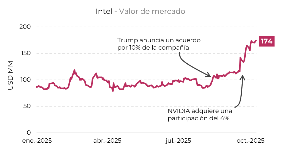 Un mes después, en agosto, Trump anunció un acuerdo con Intel, el mayor fabricante de chips del país. El gobierno adquirió una participación del 10% como parte de un acuerdo para destrabar los importantes subsidios del CHIPS Act, aprobado durante la administración Biden y fuertemente criticado por Trump por su costo fiscal. En el marco del nuevo acuerdo, Estados Unidos recibió la participación accionaria a cambio de destrabar USD 8.870 millones en subsidios.