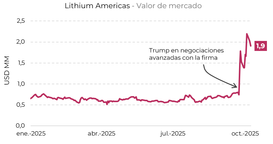 Desde que trascendieron las negociaciones, la valuación de Lithium Americas se disparó un 157%, alcanzando los USD 1.909 millones.