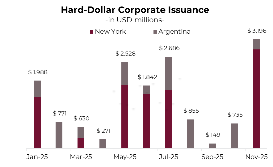 Against this backdrop, companies issued nearly USD 1.900 M in bonds over the past week: Pampa (USD 450 M due2037, 7.75%), Pluspetrol (USD 500 M due 2031, 8.38%), TGS (USD 500 M due 2035,7.75%) and Edenor (USD 204 M due 2030, 9.75%) under New York law, while Galicia (USD 144 M due 2026, 6.00%) and Banco Patagonia (USD 47 M due 2026, 6.25%) completed local-law issuances alongside Banco Hipotecario and Credicuotas. With these deals, November corporate issuance already totals USD 3.200 M —of which USD 2.900 M are under foreign law— in addition to CABA’s recent USD 600 M placement at an 8.125% yield and a 7.8% coupon. The financing calendar will remain active in the coming days: CGC aims to issue up to USD 500 M in 5-year bonds in international markets, while Genneia plans to place up to USD 300 M inmaturities ranging from 5 to 8 years. If both transactions price within the targeted amounts, total November issuance —including corporate and provincial placements— could exceed USD 4.500 M.