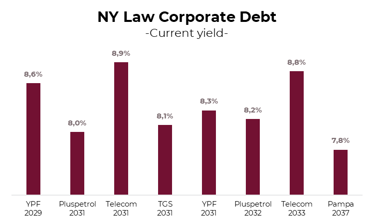 Within the local-law universe, Loma Negra 2027 LOC5O (7.3% YTM), YPF 2028 YMCZO, and Telecom 2028 TLCOO (7.4% YTM)stand out, with current yields ranging from 6.9% to 7.9%.