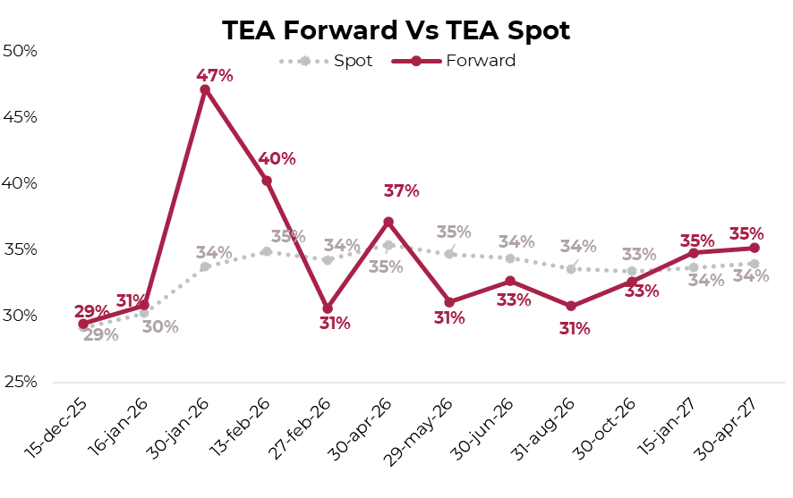 These implied yield levels forJanuary appear elevated under our assumptions —particularly in a scenario where rates may prove resistant to further declines— which reinforces the case for remaining positioned in the short end of the fixed-rate curve and reinvestingat maturity. In this context, T30E6 appears as a tactical opportunity within the short-term space, with no clear premium for extending duration toward longer maturities.