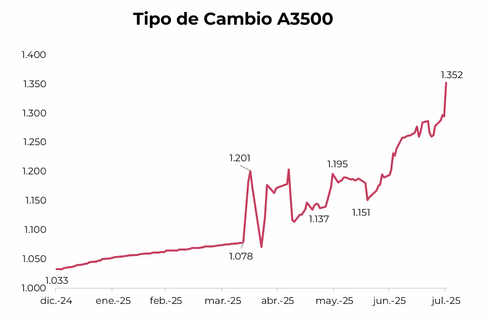 A pesar de la mayor liquidación de divisas del agro, el tipo de cambio oficial cerró julio en $1.352, lo que implicó un alza de 13,2% en todo el mes y acumulando un incremento del 25% desde la flexibilización del cepo para personas físicas. En los últimos tres meses, el tipo de cambio promedió un alza mensual de 4,2%. Aunque con un traslado a precios mucho más leve que en períodos anteriores, estimamos que el mayor ritmo de devaluación presione al alza la inflación.