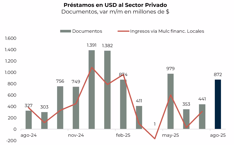 Los préstamos al sector privado en moneda extranjera volvieron a tomar impulso y el stock de documentos subió USD 872 M en agosto, casi el doble a lo que lo había hecho los dos meses anteriores y hace un año. En lo que va del 2025, aumentaron en USD 5.300 M cuando en el mismo período del año pasado habían crecido en USD 2.700 M. Dado que estos préstamos se liquidan en la plaza cambiaria, son la segunda fuente de divisas del mercado luego de las exportaciones.