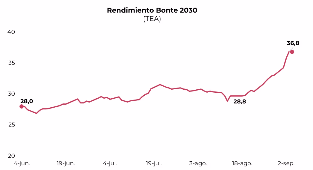 Desde inicios de agosto, el Bonte 2030 (TY30P) acumula una caída del 9,9%, con una TIR actual del 36,8%. En su debut a fines de mayo, el Tesoro logró colocar USD 1.000 M al 31,7% TIR y en la reapertura posterior otros USD 500 M al 28,5% TIR. Esto implica que un inversor que suscribió en la primera licitación a un tipo de cambio de $1.148 enfrenta hoy una pérdida del 17,9% en dólares. La mala performance desde su emisión refleja una mayor incertidumbre y un aumento en la percepción del riesgo cambiario de largo plazo. De persistir las tasas en estos niveles, el Tesoro debería convalidar un costo de financiamiento sensiblemente mayor en futuras emisiones.