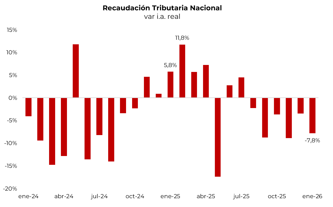 En enero, la recaudación tributaria nacional cayó 7,5% real i.a., siendo el sexto mes consecutivo con resultado negativo. El mal desempeño fue generalizado entre todos los subgrupos, salvo en impuesto a las ganancias. Los ligados al comercio exterior bajaron 29% i.a. –debido a un 41% i.a. real menos de retenciones y 13% i.a. real menos de recaudación por derechos de importación–. Los ligados a la actividad retrocedieron 3% i.a. real, anotando la tercera caída mensual consecutiva, y el mismo desempeño tuvieron los impuestos asociados al empleo, al tiempo que bienes personales aportó 13% i.a. real menos. Ganancias fue la excepción, con un alza de 0,4% i.a. real gracias a los mayores ingresos provenientes de anticipos de ganancias de sociedades con relación al año anterior. La baja en los ingresos tributarios, además de marcar que la actividad sigue estancada, obliga al gobierno a profundizar el ajuste del gasto para mantener el superávit primario.
