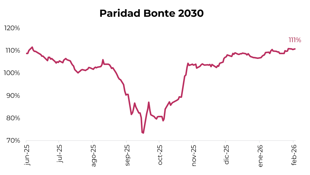 En las últimas semanas, el Bonte 2030 (TY30P) –emitido en junio de 2025 a una tasa del 29,5% TNA como instrumento en pesos orientado a la captación de financiamiento en dólares– viene ganando tracción en el mercado. El bono alcanzó paridades máximas desde junio del año pasado, reflejando una compresión relevante de rendimientos. A estos niveles, rinde en torno al 25% TNA valuado a vencimiento y acumula una ganancia cercana al 8% en el año medida en dólares MEP. Este comportamiento refleja una mejora en la percepción de riesgo y mayor apetito por duration en pesos, lo que sugiere margen para futuras colocaciones a tasas menos exigentes.