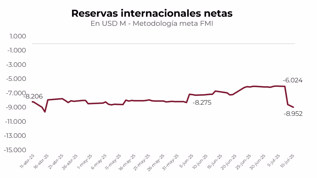 Tras el pago de los Globales y los Bonares, las reservas netas que se contabilizan para la meta con el FMI volvieron a terreno negativo y rondan los USD -9.000 M. Así, los USD 2.800 M que se habían recompuesto desde principios de junio –mediante la colocación del Bonte (USD 1.500 M), el repo (USD 500 M), compras del Tesoro por USD 400 M y desembolsos de organismos internacionales– se destinaron por completo al pago de vencimientos, dejando el por debajo del nivel previo a la flexibilización del cepo. La meta acordada con el Fondo exige cerrar el año con reservas netas en USD 1.754 M positivos, lo que implica que, de aquí a diciembre, será necesario acumular alrededor de USD 11.000 M para cumplir el objetivo.