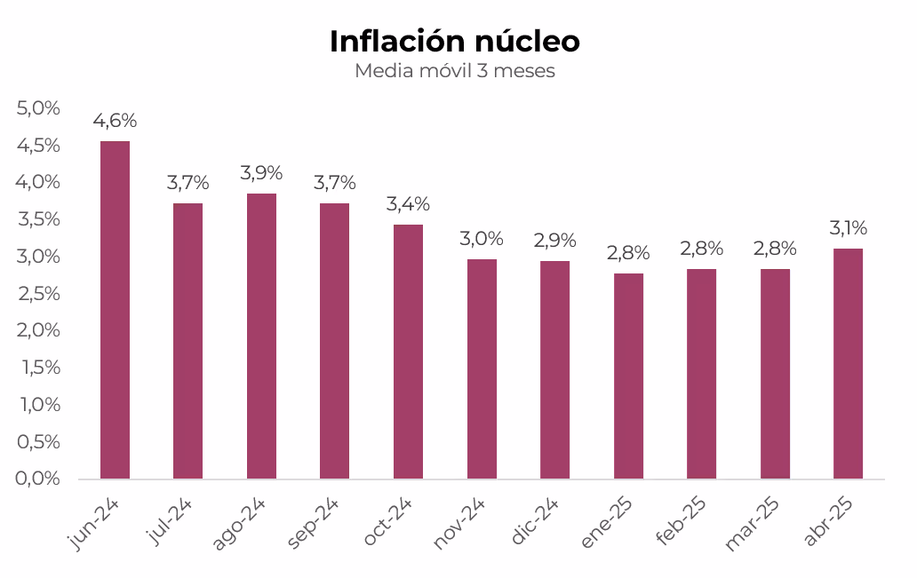 Aunque en abril la inflación general se desaceleró de 3,7% a 2,8% m/m –un dato clave en un mes con flexibilización del cepo y una suba del 4,9% m/m del tipo de cambio oficial promedio–, la núcleo se mantuvo en 3,2% m/m. La tendencia muestra resistencia: desde noviembre, la media móvil de tres meses ronda el 3% m/m, nivel que parece difícil de quebrar. En mayo se espera que la núcleo baje del 3% m/m, pero siga por encima de la general, reflejando su inercia.