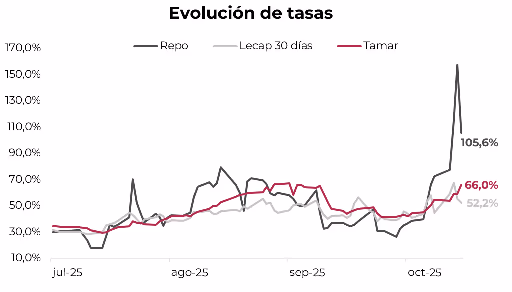 Las tasas de interés en pesos volvieron a mostrar una marcada volatilidad tras dos semanas relativamente estables. La escasez de liquidez en moneda local, derivada de la venta de divisas en el mercado spot y de la colocación de instrumentos dollar-linked en un contexto de baja demanda de pesos, obligó al BCRA a llevar la tasa Repo a un máximo de 157,3% TNA. En paralelo, la Lecap a 30 días escaló hasta 67,5% TNA, lo que llevó al Tesoro a declarar desiertas las licitaciones de instrumentos a tasa fija. Como consecuencia, hoy se inyectarán $2,1 billones al mercado, lo que podría ponerle un techo a las tasas en el corto plazo.