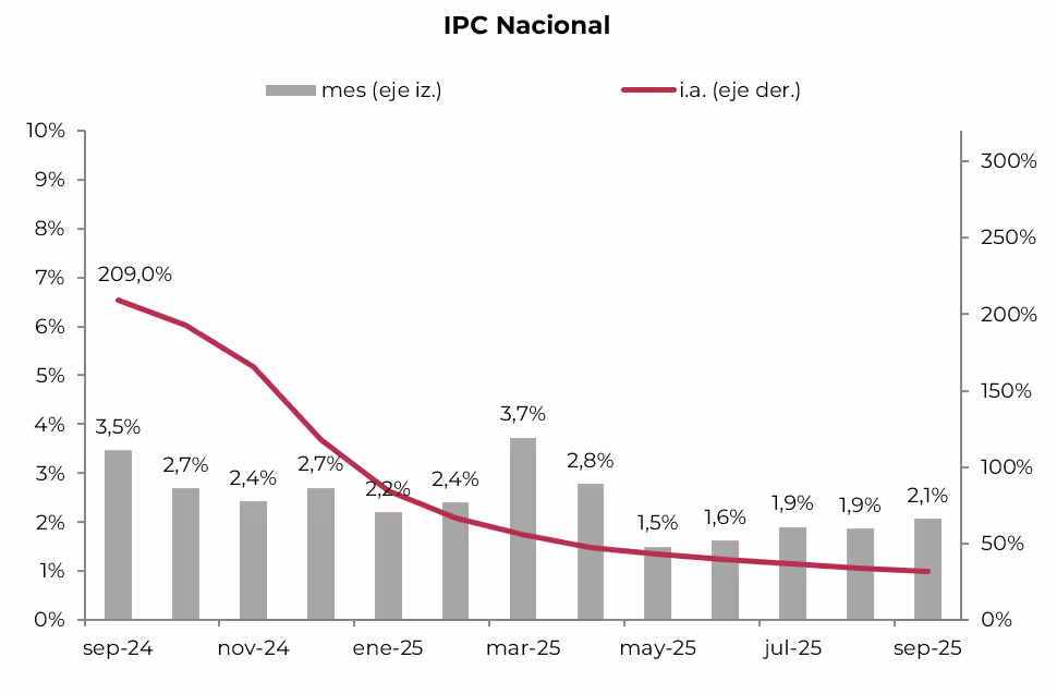 Pese a la volatilidad y suba del tipo de cambio en los últimos meses, la inflación minorista continuó estable, lo que permitió una mejora del tipo de cambio real. Concretamente, el IPC Nacional de septiembre marcó un alza de 2,1% m/m, en línea con las expectativas del mercado. El resultado del mes estuvo levemente por encima del de agosto y fue el más alto desde abril pasado, empujado por los precios estacionales que dejaron de caer y tuvieron un leve repunte, mientras que el IPC Core –que excluye los precios estacionales y regulados– subió solo 1,9% m/m. Con este resultado, en lo que va del año los precios minoristas acumulan un aumento de 22% y del 32% en los últimos 12 meses.