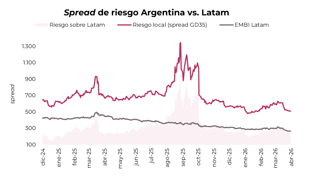 El spread de Argentina sobre Latam permanece presionado a pesar de las compras sostenidas del BCRA (USD 2.100 M en lo que va de abril y casi USD 6.500 M en el año) y los anuncios de deuda garantizada por multilaterales para el pago de obligaciones en moneda extranjera. Esto sugiere que, si bien parte de la baja de riesgo país desde 633 pb hasta 550 pb se debió al alivio de tensiones globales, persisten desafíos locales que impiden que la deuda soberana se diferencie y comprima spreads de forma sostenida por debajo de 500 pb.
