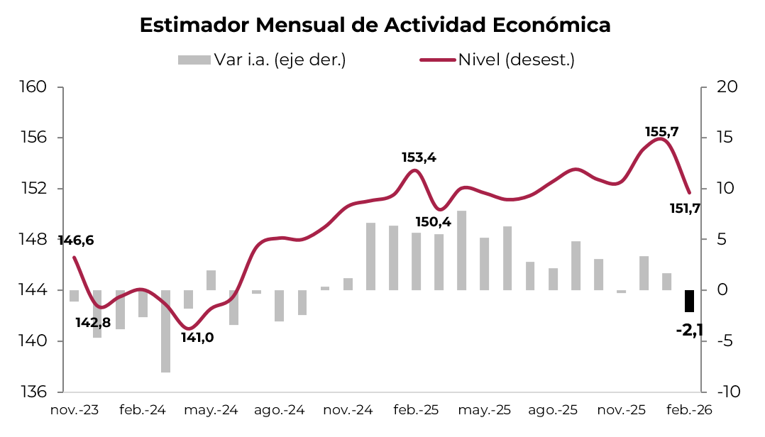 En febrero la actividad económica cayó 2,6% respecto a enero y 2,1% comparado con el mismo mes del año pasado. Como viene ocurriendo en los últimos meses, se observó un mejor desempeño en los sectores de agro (+8,4% i.a.), minería (+9,9% i.a.), intermediación financiera (+6,0% i.a.) y pesca (+14,8% i.a.). En cambio, el resto de los sectores vienen en baja, entre los que se destacaron la actividad industrial (-8,7% i.a.), comercio (-7,0%) y la construcción (-0,7% m/m). Con este resultado, en los primeros dos meses del año la actividad retrocedió 0,2% respecto al mismo período de 2025. La debilidad de la actividad económica complica el panorama fiscal, deteriora el mercado laboral y empeora la confianza en el gobierno.