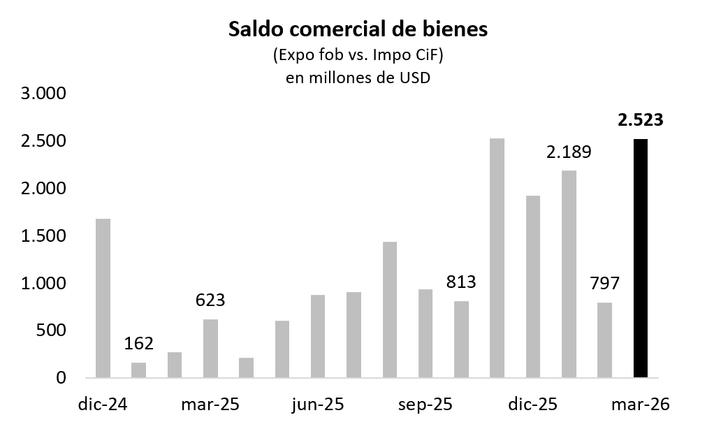 En marzo, el saldo de la balanza comercial de bienes anotó un superávit de USD 2.523 M, más de cuatro veces mayor que el de un año atrás. Esto fue gracias al alza de 30% i.a. en las exportaciones (las cantidades subieron 25% i.a. y los precios 4,0% i.a.), mientras que las importaciones apenas subieron 1,7% i.a. (el aumento de 5,8% i.a. en los precios fue compensado por una caída de 3,9% i.a. en las cantidades). Con este resultado, en los primeros tres meses de 2026 el superávit comercial llegó a USD 5.508 M, muy superior al del mismo período del año pasado cuando había llegado a USD 1.060 M. Esta mejora estuvo determinada por el incremento de 17% i.a. en las exportaciones y una baja del 7% i.a. en las importaciones. El mayor excedente comercial es clave para mejorar el resultado de la cuenta corriente y que el BCRA compre divisas en el mercado de cambios para robustecer su posición de reservas internacionales.
