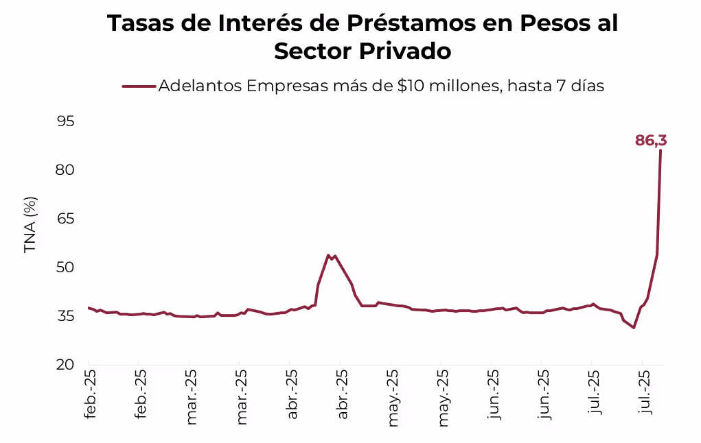 Tras el desarme de LEFI, que culminó el 17 de julio, las tasas de interés de los préstamos en pesos al sector privado registraron una fuerte suba. En particular, la tasa de adelantos a empresas se disparó del 38% TNA a comienzos de julio al 86% TNA en la actualidad, un incremento de 48 puntos porcentuales. Si bien es esperable cierta moderación en el corto plazo, niveles tan elevados podrían afectar la actividad económica, al encarecer sensiblemente el crédito al sector privado.