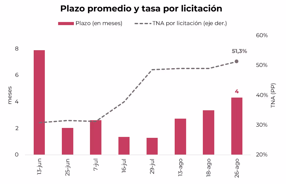 En la última licitación, el Tesoro colocó $7,66 billones frente a vencimientos por $7,72 billones, logrando un rollover del 100% y del 95% en todo el mes. El resultado estuvo apuntalado por la suba de encajes del BCRA, que habilitó a los bancos a integrar parte de las exigencias con títulos de más de 60 días suscriptos en primario. Esto impulsó la demanda por plazos más largos y permitió extender la promedio a más de cuatro meses, despejando vencimientos de 2025 a una tasa promedio del 51,3% TNA, más alineada con las tasas en el mercado secundario.