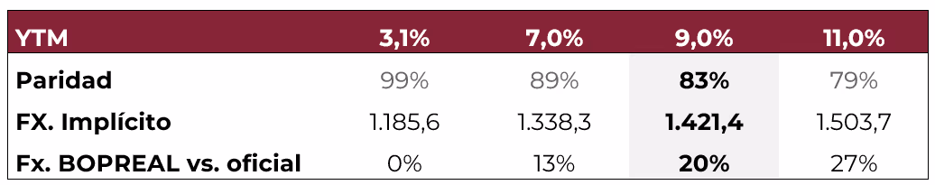 Por otro lado, el nuevo Bonte 2030 (TY30P) es una buena alternativa, pese a la compresión de rendimientos observada en el mercado secundario luego de su colocación al 29,5% TNA (hoy 25,9% TNA). Si se evalúa en un horizonte de 12 meses, el TY30P podría ofrecer un rendimiento en dólares atractivo, aun en un escenario de descompresión de tasas. Incluso si las tasas se mantuvieran en los niveles actuales, el tipo de cambio breakeven se ubicaría en $1.493.