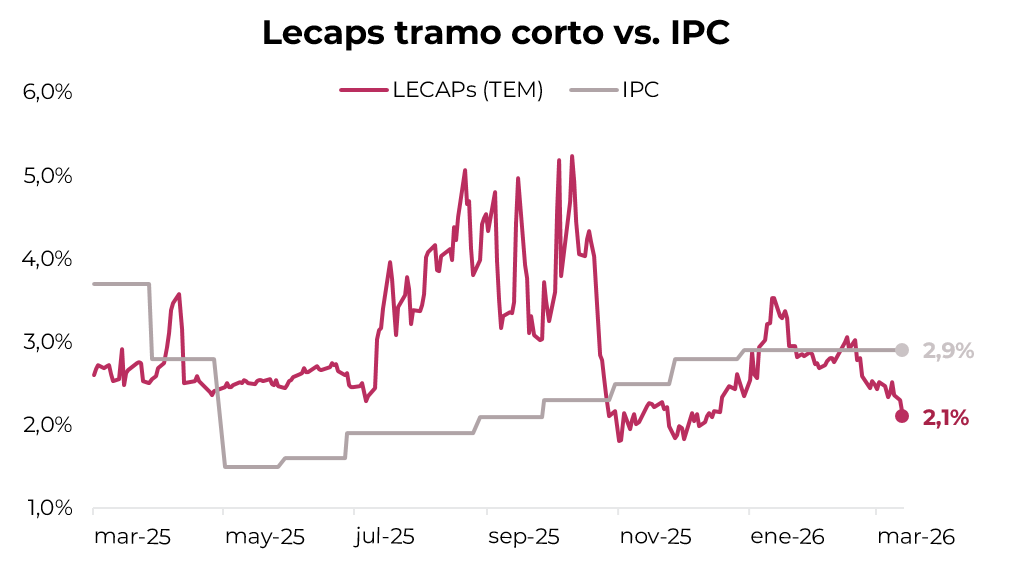 Por otro lado, sostenemos posición en el dual TTD26 (TAMAR +2,8%), que actualmente descuenta una TAMAR implícita en torno al 26% TNA, por debajo del nivel vigente de 28,8% TNA, y sumamos el dual TTS26 (TAMAR +2,8%). En la medida en que las tasas muestren una leve tendencia al alza, esto debería traducirse en una mayor tasa promedio devengada por estos instrumentos.